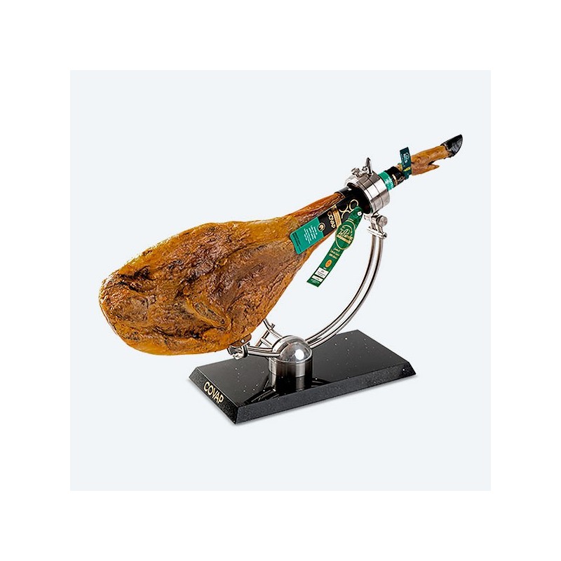 Un Jamón de bellota 100% ibérico seleccionado exclusivamente por su pureza racial y equilibrio, con un profundo respeto a la tradición artesanal. Es sin duda una pieza excepcional. Su jugosa carne, gracias al entreverado de la grasa, de color rojo intenso virado a tonos rosados y mezclado con el brillo del magro, presenta un sabor único con una sorprendente combinación de notas opuestas dulces y saladas, que evocan a la bellota, a la miel, a tierra húmeda y a trufa y que dan como resultado una explosión de sabor intenso, invasor y persistente que invita siempre a repetir.