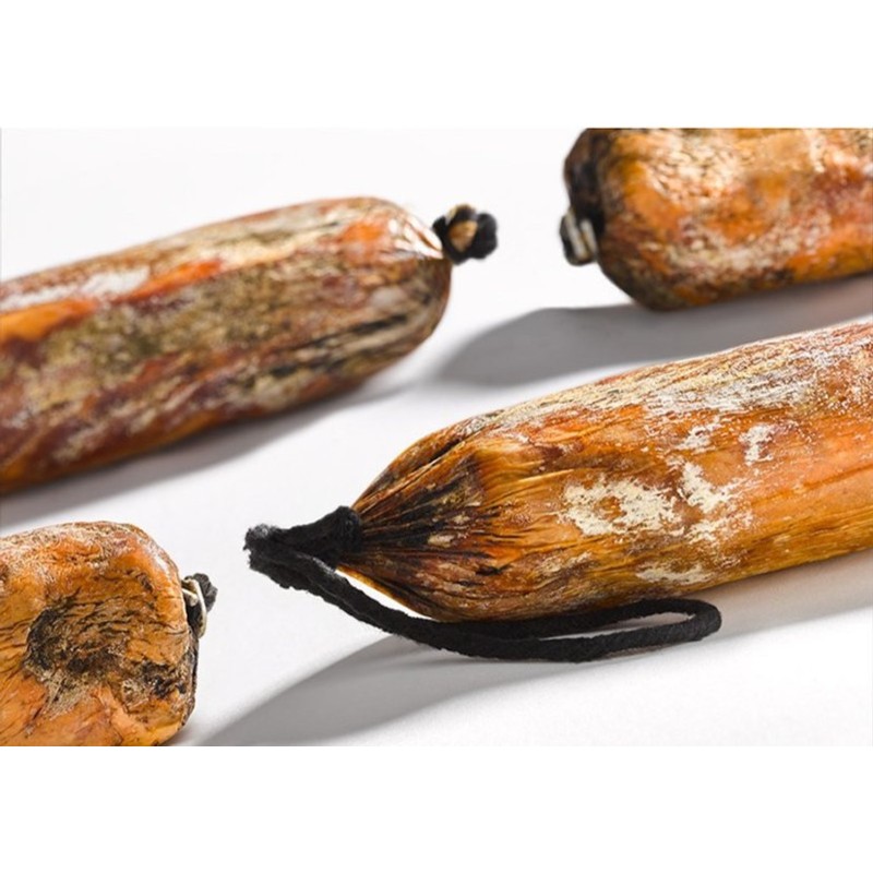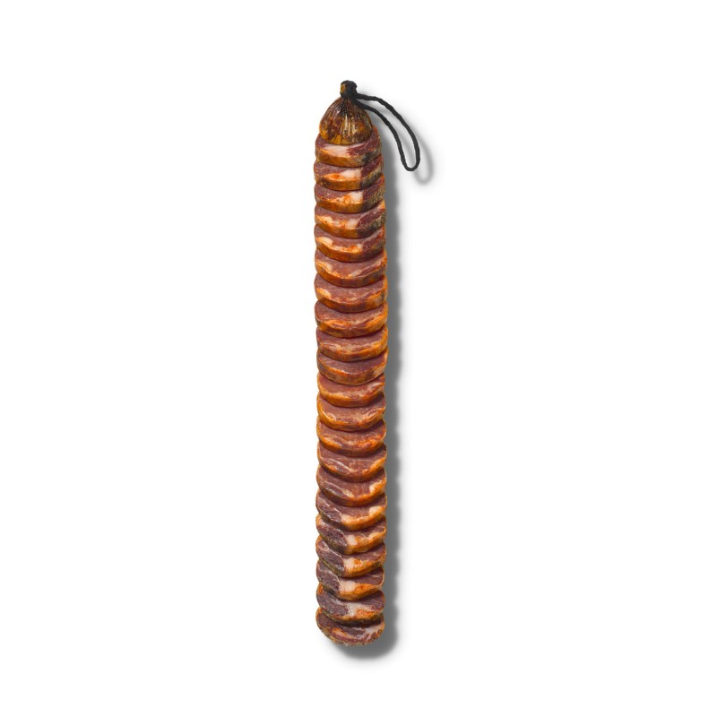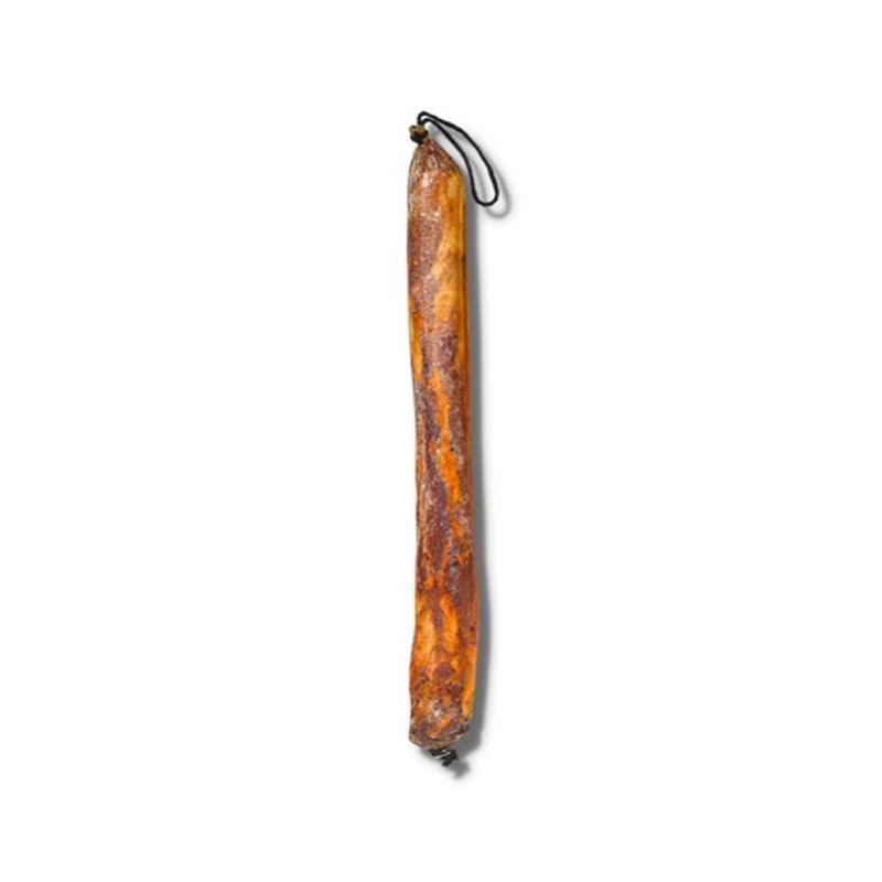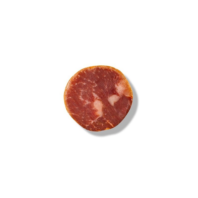 La Caña de Lomo presenta un aspecto rojizo de distintas tonalidades, desde el intenso rojo ciruela, pasando por el carmín hasta un apagado bermellón que se combina con el inequívoco signo de jugosidad que aporta el ribeteado de fina grasa; blancas líneas que se entremezclan para dar lugar a una pieza de inmenso sabor y fragrante aroma. Un alimento totalmente natural, sin conservantes ni aditivos, que aportará salud por su elevado valor proteico a una dieta sana y equilibrada.