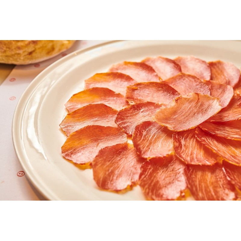 Aroma intenso y dulce, de tonos frescos matizados por finos destellos de pimentón que nos trasladan al campo verde, y lentamente enriquecidos por un proceso de curación en secaderos naturales. Su textura, cariñosa y suave en la mordida, es una combinación perfecta entre cremosidad, jugosidad y distinguida ternura. La explosión inicial de su sabor es exuberante, hasta acariciar el paladar de una forma sutil y completa, que incita a darle continuidad.